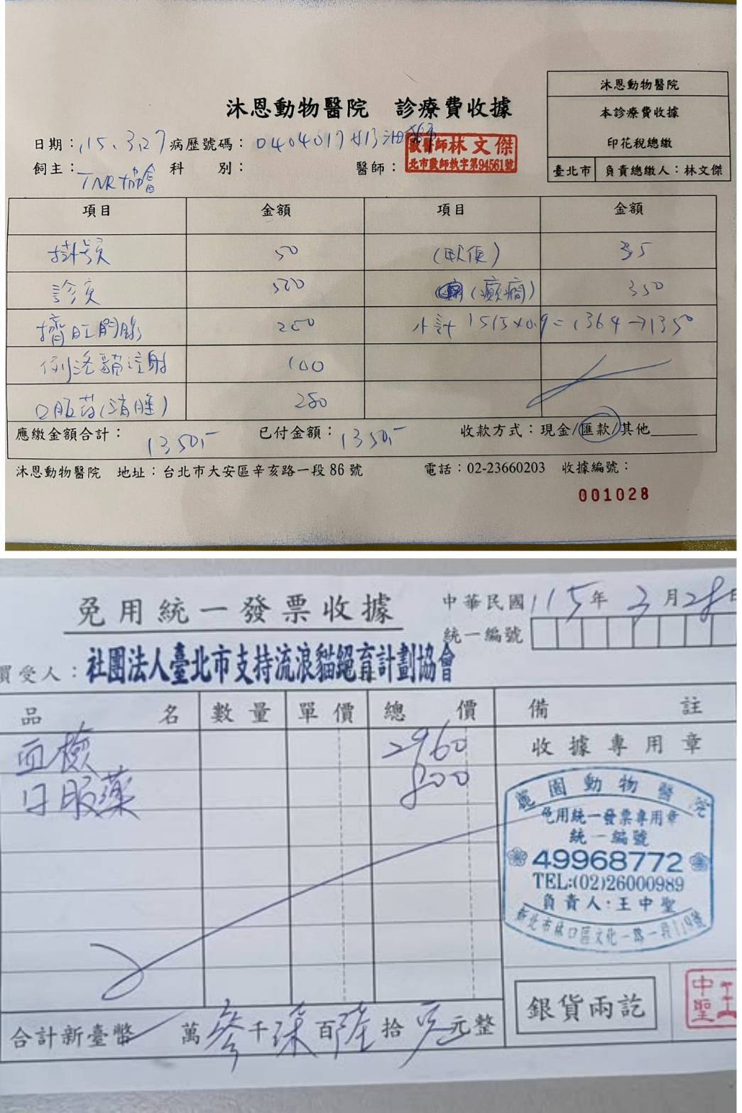 2026年3月27日於沐恩看診,此次進行力洛貓施打,童詩醫師協助清理右側肛門腺,務必保持屁股周圍貓都要持續維持短短,長長要剃短。因為奶油獅無法自己清潔舔到屁股,要麻煩每天都要擦屁股清潔。抗癲癇藥也須長期服用。本筆醫助是2026年3月27日間於沐恩醫院回診血檢及取藥的費用。