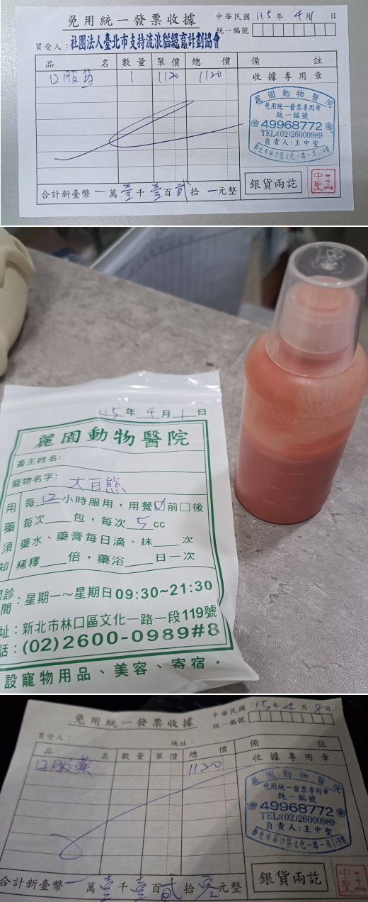 2026年3月27日於沐恩看診,此次進行力洛貓施打,童詩醫師協助清理右側肛門腺,務必保持屁股周圍貓都要持續維持短短,長長要剃短。因為奶油獅無法自己清潔舔到屁股,要麻煩每天都要擦屁股清潔。抗癲癇藥也須長期服用。本筆醫助是2026年3月27日間於沐恩醫院回診血檢及取藥的費用。