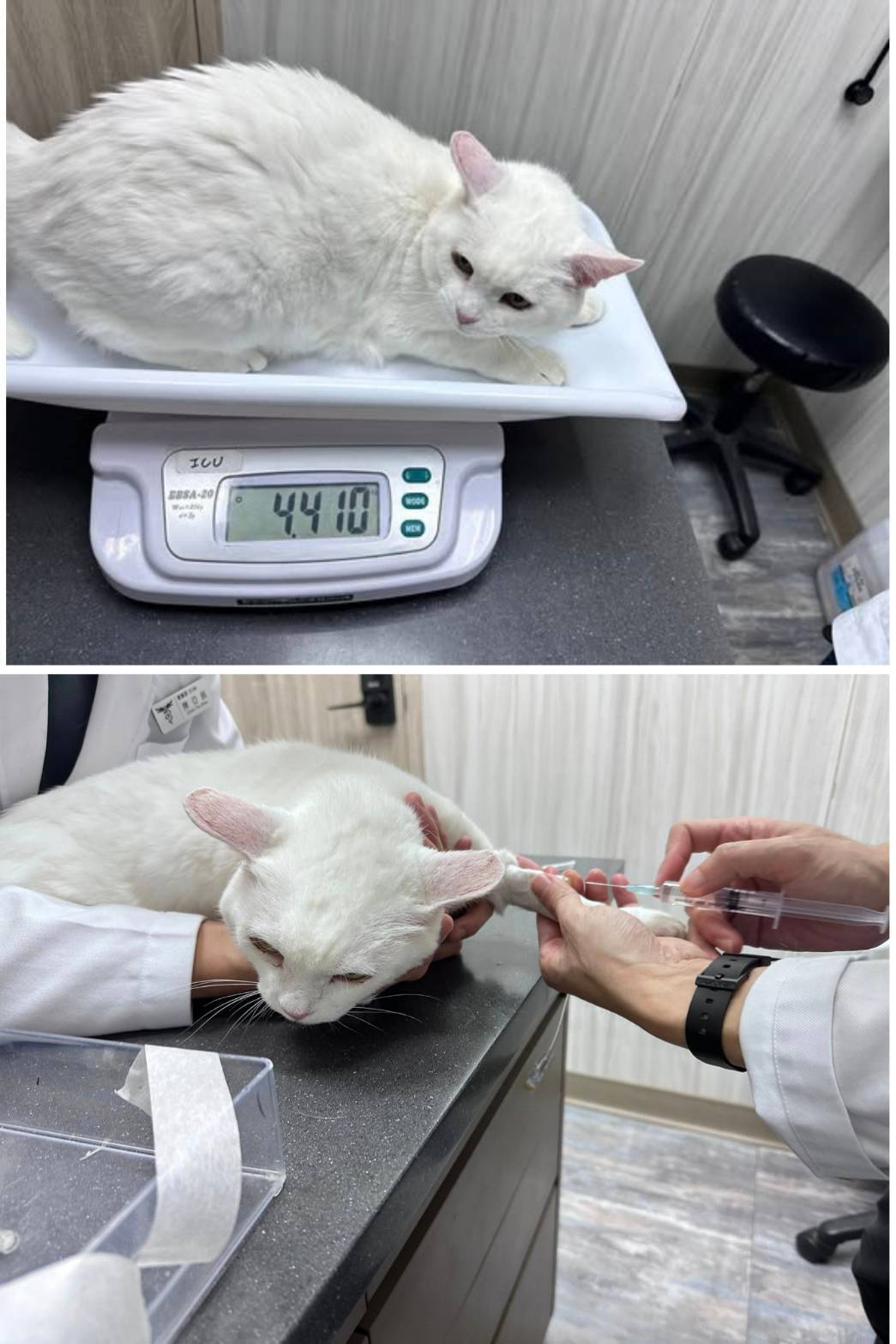 小白是很漂亮的純白貓咪美女,目前食慾精神都很穩定,因關節退化問題,走路看起來是踩著小碎步,相當可愛,照護員每天持續讓她吃關節保養品控制關節退化,也每週測量體重紀錄,只是畢竟小白年紀已大,腎臟功能的衰退是不可逆,只希望經由用藥能延緩病情及維持生活品質,本筆醫助是2026年3月31日間於沐恩醫院的費用,包含針劑施打等。