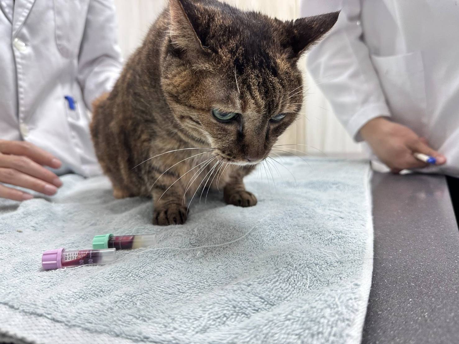 血檢結果除了發炎指數較高,其他指數並無異常,X光檢查,肺部沒有塌陷或是發炎跡象,根據檢查結果研判是較單純的呼吸道症狀,所以喵喵醬就先留在台北安養之家。