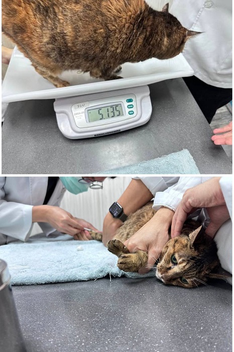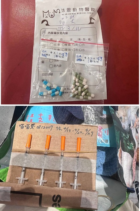 只是在7月11日喵喵醬又出現嘔吐,回報沐恩醫院後,因食慾仍還可以,所以先拿回止吐針劑,加入皮下輸液一起打,打完後幾日喵喵醬沒有再出現嘔吐,但食慾方面仍不是很穩定,照護員保持每天仔細觀察以回報醫師。