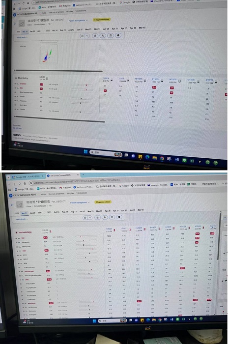 近期2025年8月12日因連續多日嘔吐及食慾不振安排回診,因擔心是胰臟炎安排超音波診斷,所幸未發現特殊狀況,唯有指數上升,研判是嘔吐造成,因此再加開胃乳,並持續觀察回報醫院。一個禮拜後8/19再度回診查看腎指數已有下降,需持續觀察食慾及嘔吐狀況。2025年10月14日為定期回診,體重與整體指數皆維持在正常範圍內,只需再注意是否有嘔吐情況, 若有嘔吐需打皮下,可再延長下次回診時間。