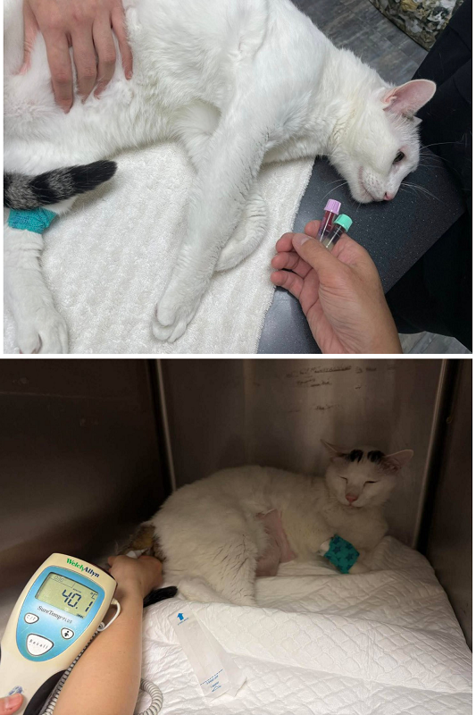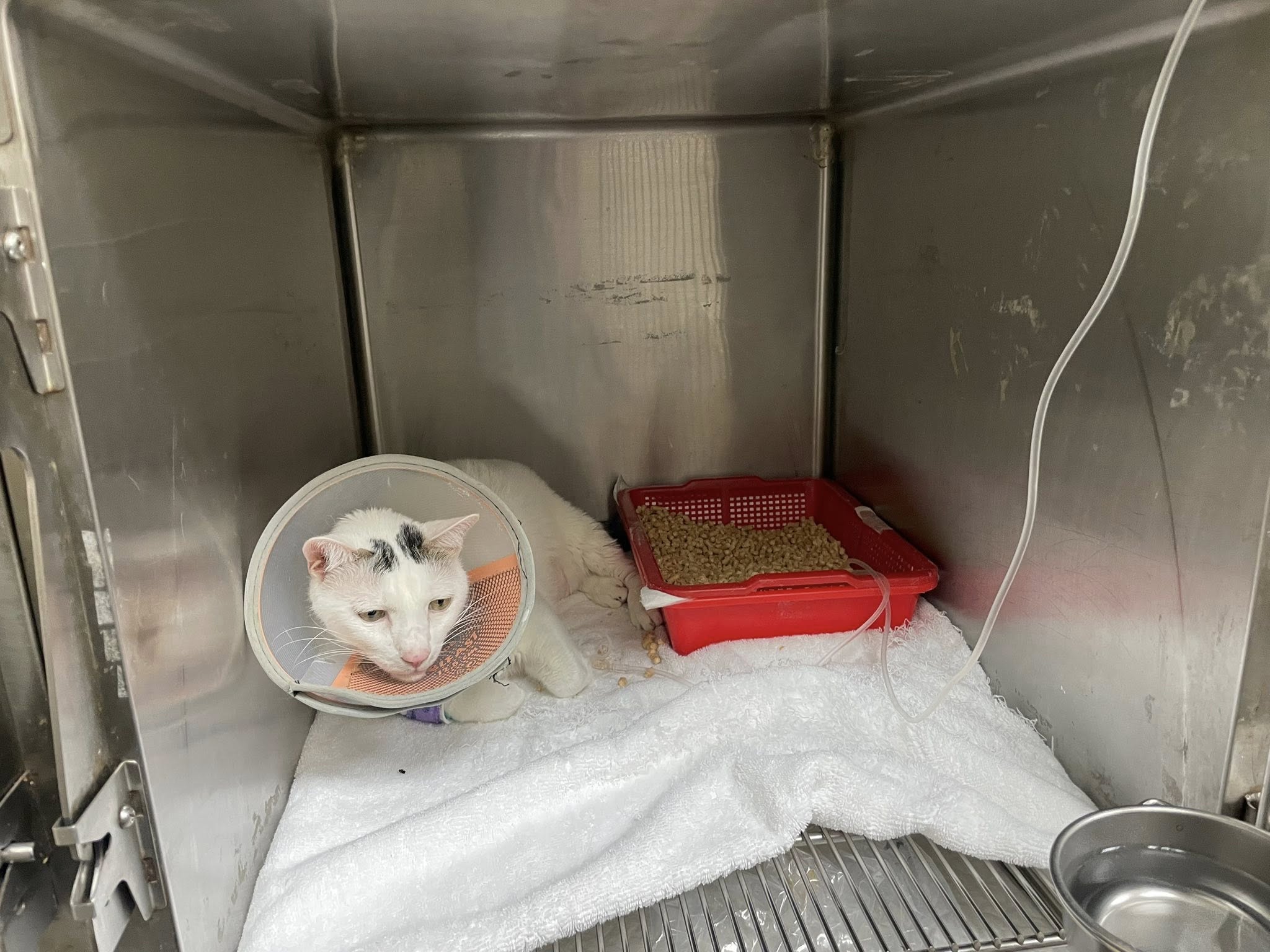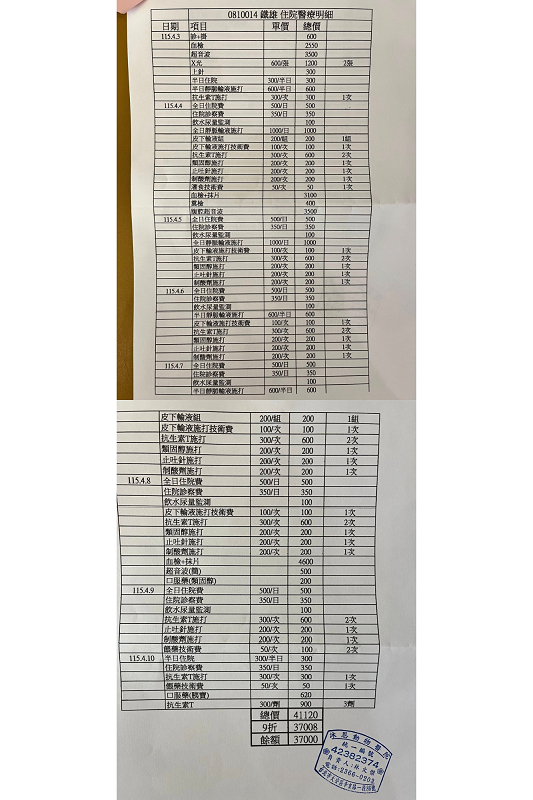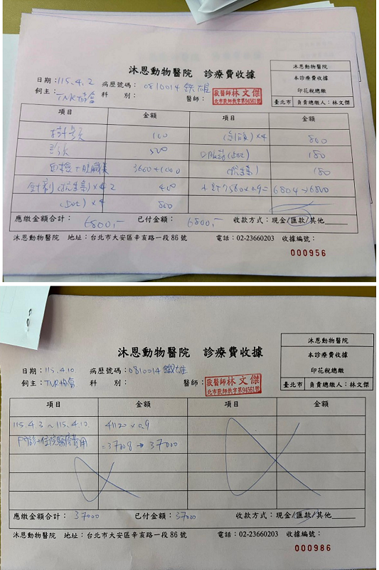 2026年4月發現鐵雄連續兩日未自主進食且精神萎靡,於4月2日至沐恩看診,檢查發現體溫高達40度已發燒且因脫水血糖偏高,血檢結果無其他偏高症狀,先行開立止吐抗生素等藥物治療,並須注意如進食未達標準量10克以上則需灌食。目前因鐵雄持續狀況不佳已安排於4月3日沐恩醫院住院觀測治療。住院至4月7日間持續進行靜脈點滴注射、預計4月8日可以停止靜脈注射點滴改為皮下點滴,再觀察整體精神跟身體狀況。並於4月8日同天確認鐵雄為胰臟炎。在經過兩日住院觀察治療後鐵雄已可自主進食且食慾皆正常、各項指數已平穩,於是安排2026年4月10日出院回協會繼續觀察照護。本筆醫助是2026年4月2日至2026年4月10日間於沐恩醫院的費用,包含看診、住院、靜脈點滴注射、血檢及用藥。