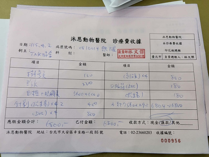 2026年4月發現鐵雄連續兩日未自主進食且精神萎靡,於4月2日至沐恩看診,檢查發現體溫高達40度已發燒且因脫水血糖偏高,血檢結果無其他偏高症狀,先行開立止吐抗生素等藥物治療,並須注意如進食未達標準量10克以上則需灌食。目前因鐵雄持續狀況不佳已安排於沐恩醫院住院觀測治療。本筆醫助是2026年4月2日於沐恩醫院的費用,包含看診血檢及用藥。