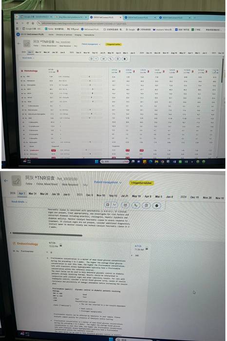 2026年3月24日於沐恩回診口腔,目前狀況還是持續紅腫先以抗病毒藥物治療,因長效性干擾素感覺比之前持久度降低許多,效果不佳暫時先不用干擾素改成抗病毒藥物看看能否好轉。後於3月31日進行血檢,血糖偏高,要控制飲食,注意不要越吃越多,血糖會不好控制。早上有拉泥便帶血且黏稠狀,醫師表示可能大腸發炎,拉乾淨就好。口腔部分已沒有流口水及撥嘴,嘴內兩側還是紅但比上次好,舌頭已無潰瘍。抗病毒藥有效且無影響肝指數可繼續吃。為控制口炎,類固醇減量,皮膚黴菌有緩解,再多吃一週黴菌藥。
