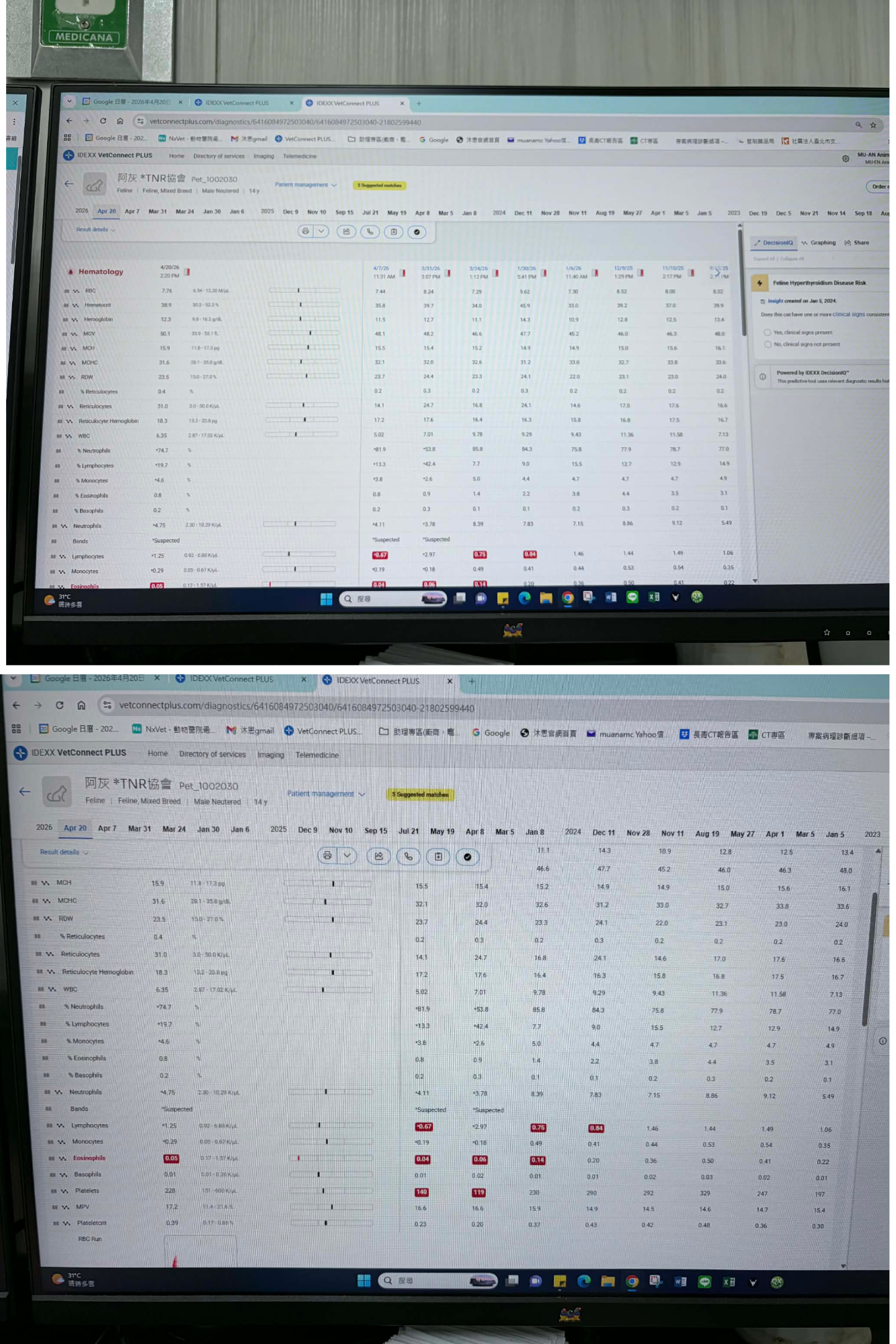 2026年1月6日於沐恩回診,血檢部分免疫球蛋白偏高其他指數則在正常範圍內。此次口腔發炎部分有明顯消腫可於兩個月後再回診查看,但若流口水有便嚴重的話則需提前回診。原先吃的止癢藥因皮膚狀況也變好可先減量。後因阿灰一直嘔吐及流口水撥嘴巴動作提早於1月27日回診看診,林醫師建議先一個月一次高劑量干擾素施打,直到1月30日依然連續嘔吐不止因此住院觀察,直到31日監測結果無大礙於31日出院。醫師表示食物方面可任食,但種類盡量單純,會吃就先不變換食物。