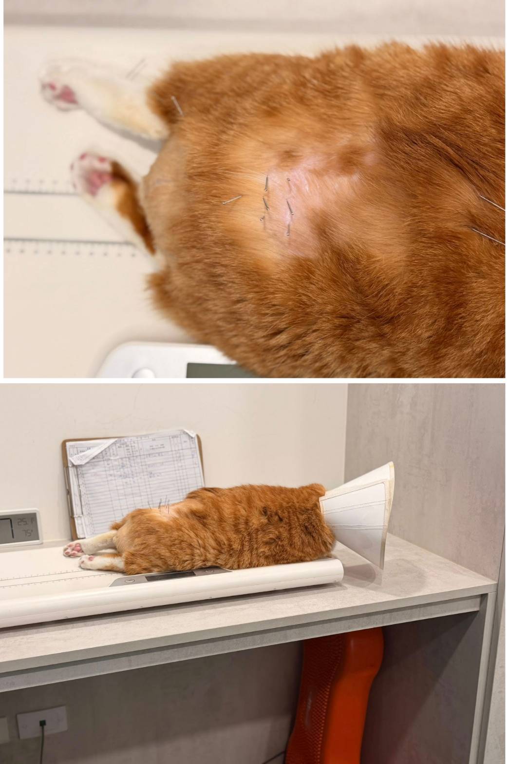 大福幾年來持續於小王子醫院的針灸療程,會同時進行觸診檢查腸道,看看膀胱有沒有積尿、腸道是否有積便,因每天吃幫助排便的用藥,經常是泥便居多,但以大福曾因痾便困難、需要鎮定浣腸的情況下,泥便反而是較好的,且同時大福的體重食慾精神都維持穩定,所以就不需擔心時常泥便的問題,另外持續針灸及復健的醫療照護,讓大福的後肢肌肉量維持足夠、沒有萎縮,有時還能像正常貓咪般的站立,隨著大福的狀況越來越穩定,針灸療程從每週一次,已經可以拉長回診間隔了,近幾次回診,體重一度有減輕一點,可能是因為泥便量較多,但食慾看起來是沒有減少的,且醫師認為還是有維持在標準內、太重也不好。2026年1月14日於小王子看診,體重有減輕,繼續保持,但最好減重到理想體重5.7Kg上下。再於2026年2月4日於小王子看診,此次發現後背尾端有患處,醫生說不像是黴菌,看起來是過敏或摩擦傷,先不剃毛溫水清潔,看看2天後有沒有退紅。