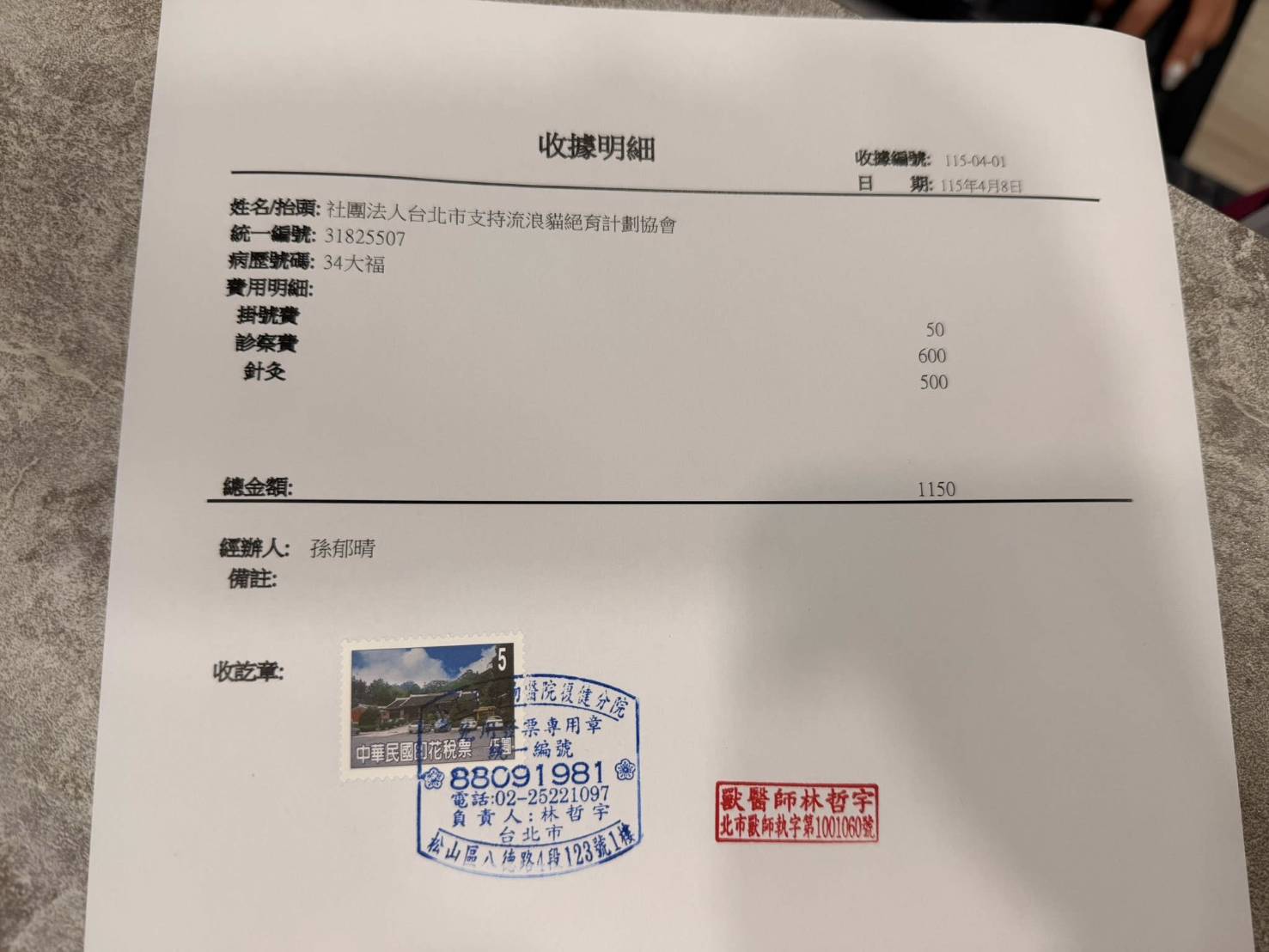 大福的針灸復健會是終身需求,本筆醫助是自2026年3月18日至2026年4月8日間至小王子醫院復健科的針灸醫療及沐恩醫院看診的費用,包含血檢及用藥。