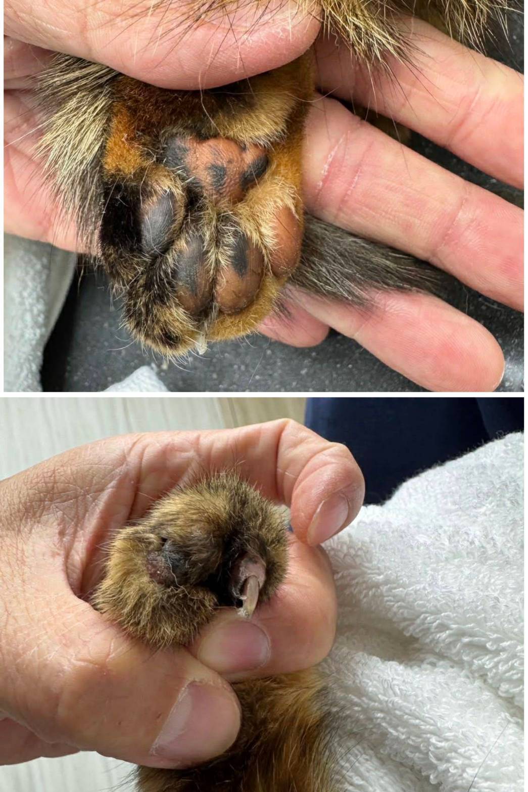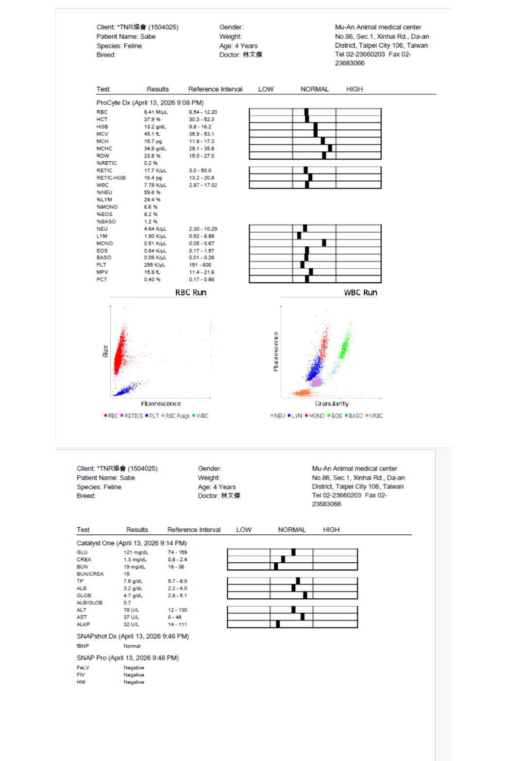 有晶片,身體很健康,血檢沒問題,腳有可能是先天發育異常,因為右後腳剛好也有一趾是沒發育完成的,其他身體的臟器,並沒看到有發育異常的問題。牙齒很好,沒貓愛滋/貓白血/心絲蟲,心臟快篩也是正常的,只是有跳蚤點了一錠除。