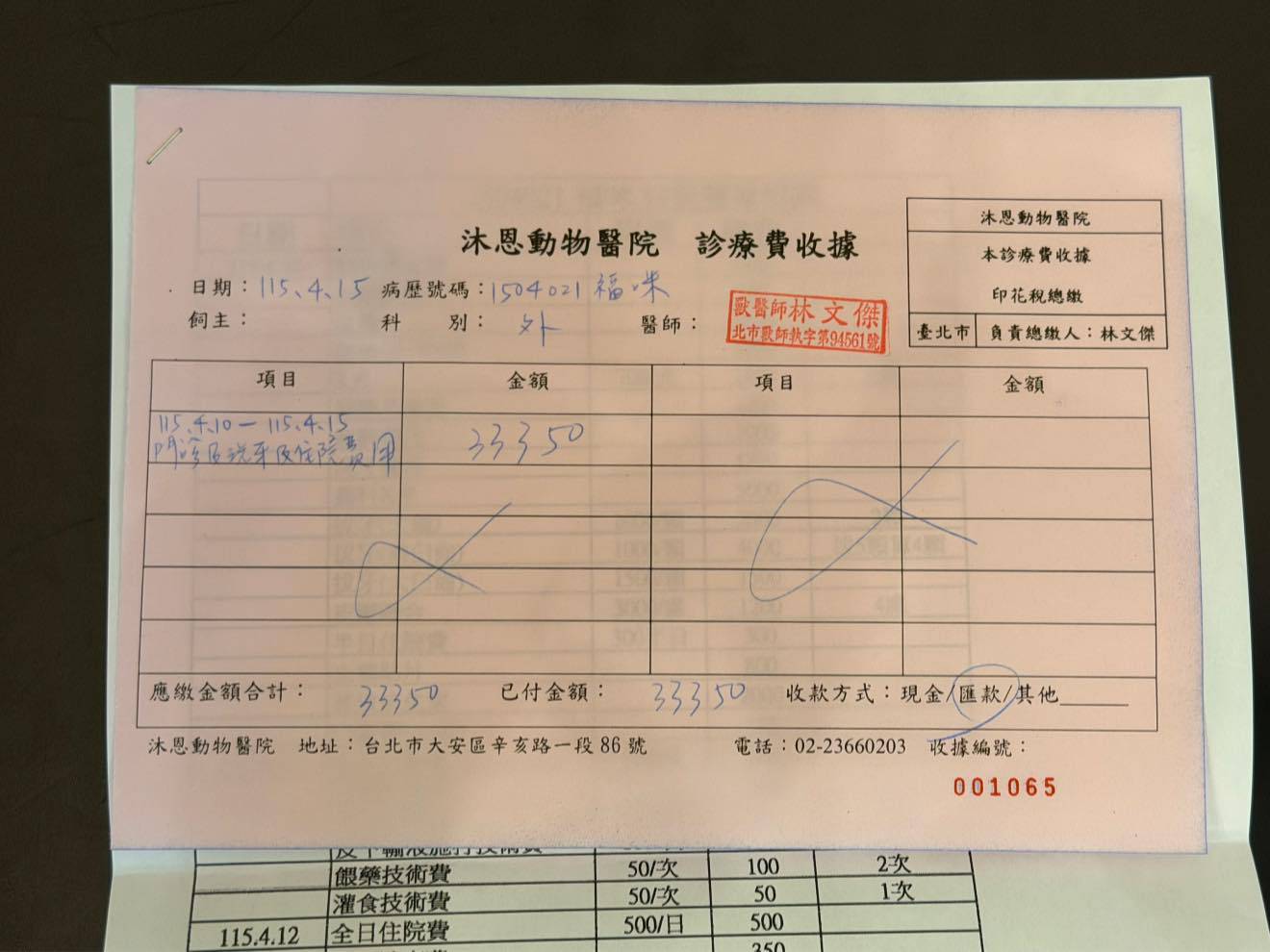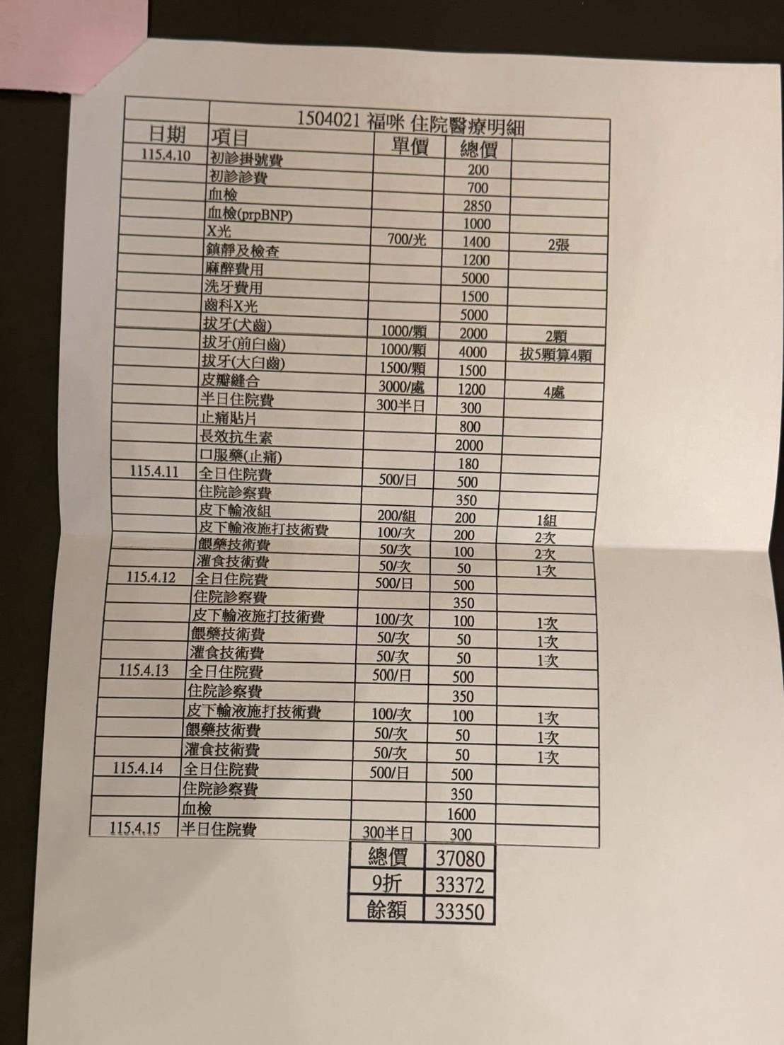 福咪是很漂亮的三花母貓咪,圓圓的臉蛋及身材非常可愛,安養之家舒適的環境及優質飲食讓她越來越放鬆了,希望福咪能夠保持健康,好好享受安養之家的幸福生活。本筆醫助是福咪自2026年4月10日至2026年4月15日於沐恩醫院的費用,包含看診、牙周手術、住院、血檢及用藥。