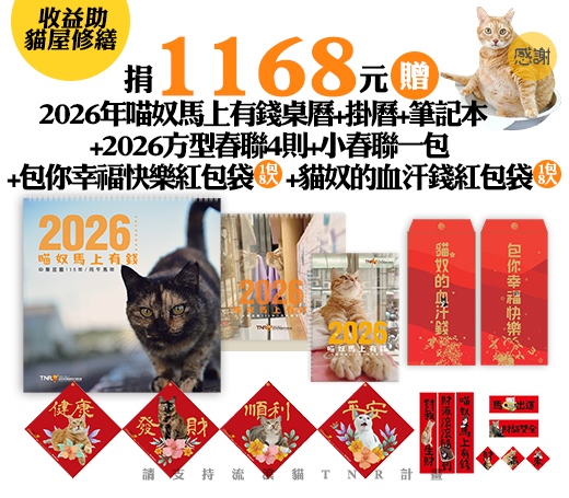 贈品名稱: 捐1168元贈2026年喵奴馬上有錢桌曆+掛曆+筆記本+2026方型春聯4則+小春聯一包+包你幸福快樂紅包袋(1包8入)+貓奴的血汗錢紅包袋(1包8入)收益助貓屋修繕 贈品總數: 50人 每人捐款金額: 1168元 已報名名額: 0 尚需求名額: 50 報名人員: 候補人員: 說明: 捐1168元贈2026年喵奴馬上有錢桌曆+掛曆+筆記本+2026方型春聯4則+小春聯一包+包你幸福快樂紅包袋(1包8入)+貓奴的血汗錢紅包袋(1包8入)收益助貓屋修繕
