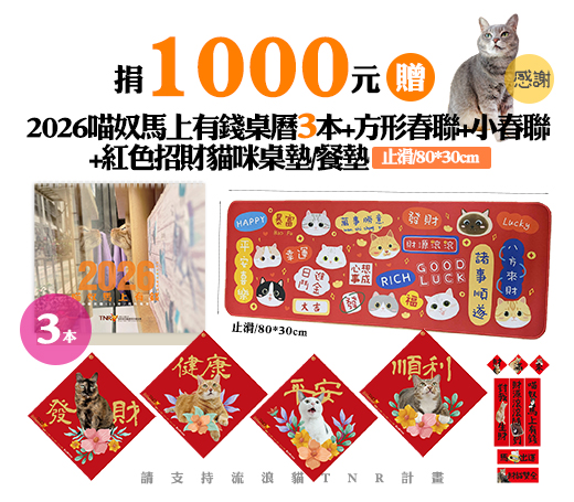 候補人員: 說明: 捐1000元贈2026喵奴馬上有錢桌曆3本+方形春聯+小春聯+紅色招財貓咪桌墊/餐墊(止滑/80*30cm)