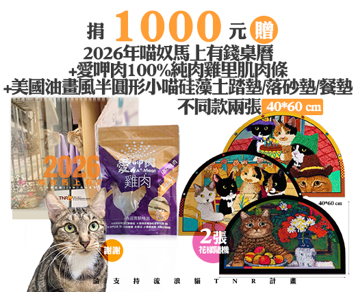 贈品名稱: 捐1000元贈2026年喵奴馬上有錢桌曆+愛呷肉100%純肉雞里肌肉條+美國油畫風半圓形小喵硅藻土踏墊/落砂墊/餐墊不同款兩張(40*60 cm) 贈品總數: 40人 每人捐款金額: 1000元 已報名名額: 2 尚需求名額: 38 報名人員: 1.迦迦 (已付款)