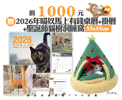 候補人員: 說明: 捐1000元贈2026年喵奴馬上有錢桌曆+掛曆+聖誕節貓樹洞睡窩(55*55cm)
