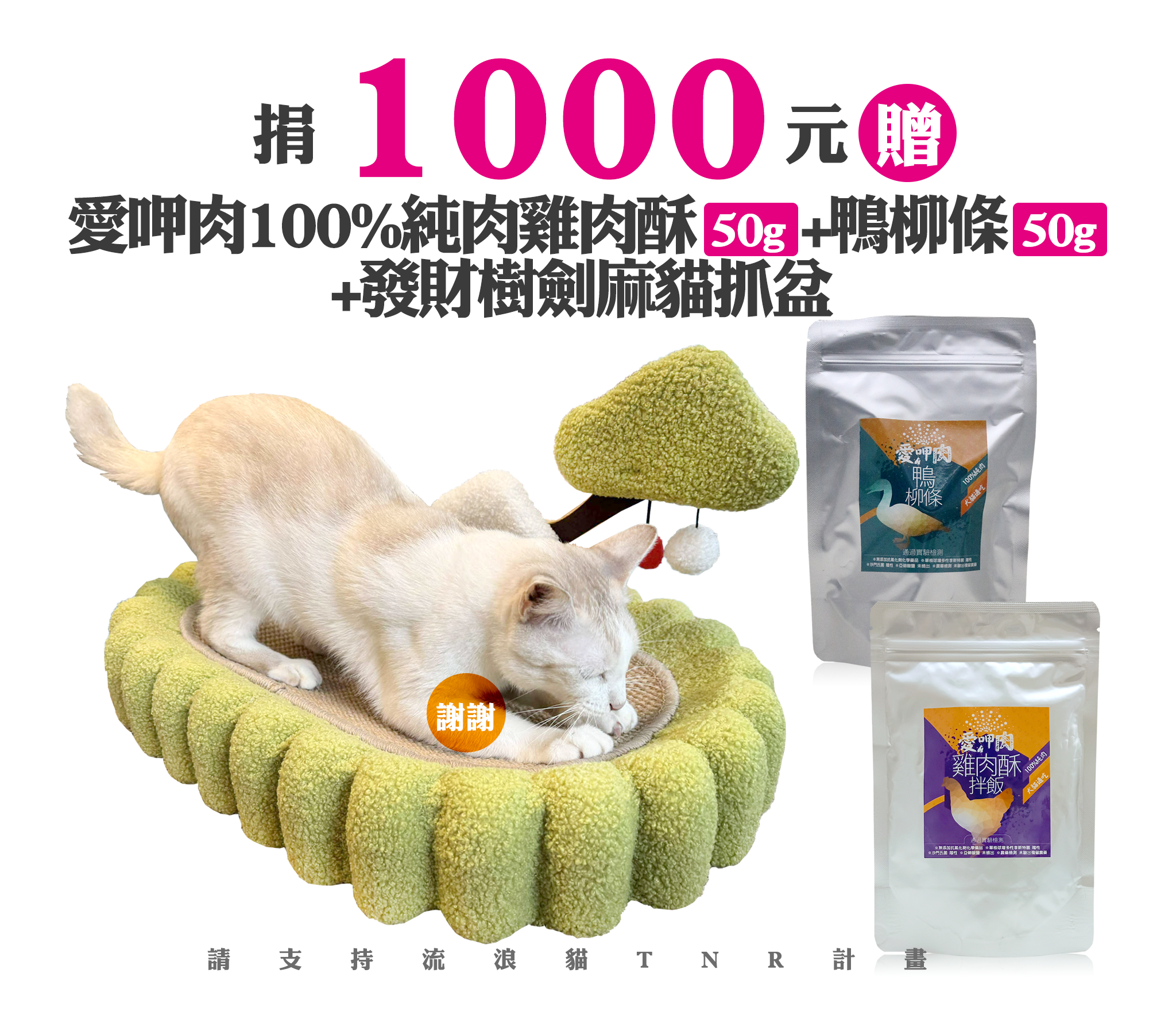 候補人員: 說明: 捐1000元贈愛呷肉100%純肉雞肉酥(50g)+鴨柳條(50g)+發財樹劍麻貓抓盆