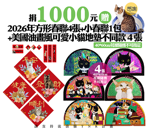 贈品名稱: 捐1000元贈2026年方形春聯4張+小春聯1包+美國油畫風可愛小貓地墊不同款4張(40*60cm/花樣隨機不可指定) 贈品總數: 25人 每人捐款金額: 1000元 已報名名額: 4 尚需求名額: 21 報名人員: 1.Liz (已付款)