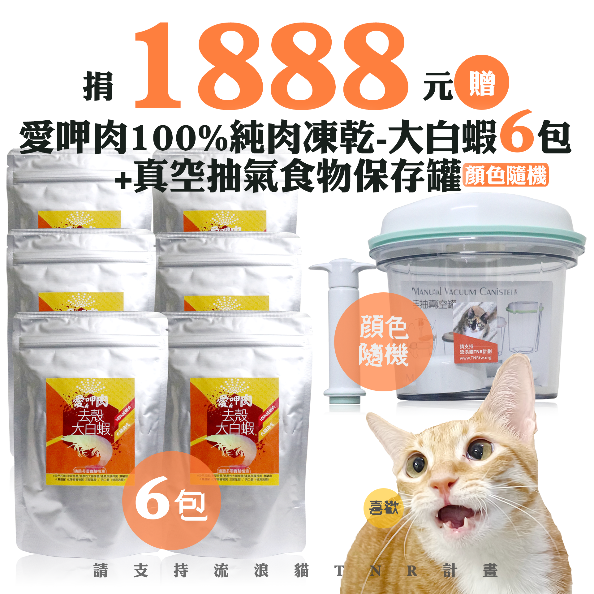 贈品名稱: 捐1888元贈愛呷肉100%純肉凍乾-大白蝦6包+真空抽氣食物保存罐(顏色隨機) 贈品總數: 50人 每人捐款金額: 1888元 已報名名額: 0 尚需求名額: 50 報名人員: 候補人員: 說明: 捐1888元贈愛呷肉100%純肉凍乾-大白蝦6包+真空抽氣食物保存罐(顏色隨機)