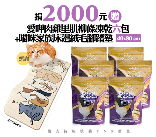 贈品名稱: 捐2000元贈愛呷肉雞里肌柳條凍乾六包+喵咪家族床邊絨毛腳踏墊(40x80 cm) 贈品總數: 20人 每人捐款金額: 2000元 已報名名額: 0 尚需求名額: 20 報名人員: 候補人員: 說明: 捐2000元贈愛呷肉雞里肌柳條凍乾六包+喵咪家族床邊絨毛腳踏墊(40x80 cm)