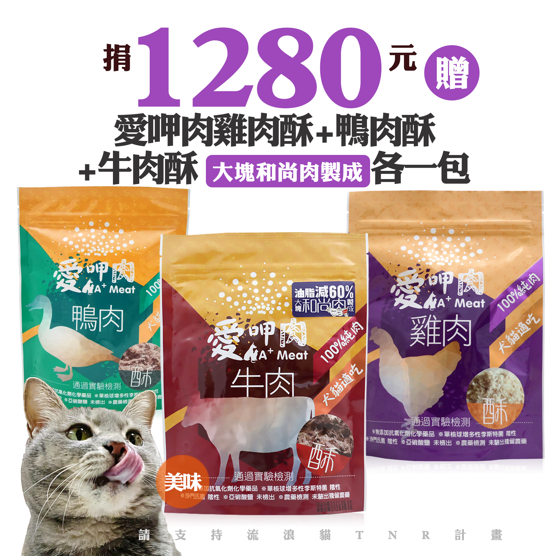 贈品名稱: 捐1280元贈愛呷肉雞肉酥+鴨肉酥+牛肉酥(大塊和尚肉製成)各一包 贈品總數: 50人 每人捐款金額: 1280元 已報名名額: 0 尚需求名額: 50 報名人員: 候補人員: 說明: 捐1280元贈愛呷肉雞肉酥+鴨肉酥+牛肉酥(大塊和尚肉製成)各一包