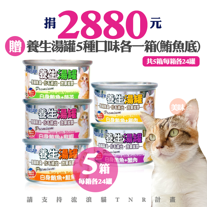 贈品名稱: 捐2880元贈養生湯罐5種口味各一箱(鮪魚底) (共5箱/ 每箱各24罐) 贈品總數: 50人 每人捐款金額: 2880元 已報名名額: 0 尚需求名額: 50 報名人員: 候補人員: 說明: 捐2880元贈養生湯罐5種口味各一箱(鮪魚底) (共5箱/ 每箱各24罐)