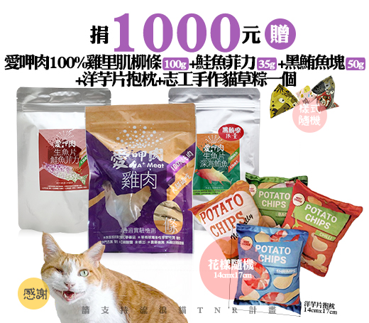 贈品名稱: 捐1000元贈愛呷肉100%雞里肌柳條(100g)+鮭魚菲力(35g)+黑鮪魚塊(50g)+洋芋片抱枕+志工手作貓草粽一個 贈品總數: 30人 每人捐款金額: 1000元 已報名名額: 0 尚需求名額: 30 報名人員: 候補人員: 說明: 捐1000元贈愛呷肉100%雞里肌柳條(100g)+鮭魚菲力(35g)+黑鮪魚塊(50g)+洋芋片抱枕+志工手作貓草粽一個
