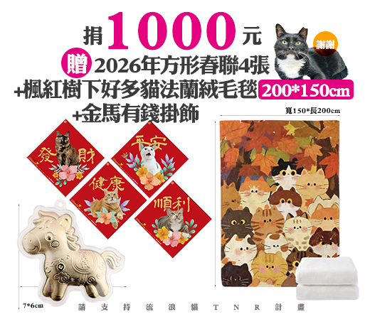 贈品名稱: 捐1000元贈2026年方形春聯4張+楓紅樹下好多貓法蘭絨毛毯(200*150cm)+金馬有錢掛飾 贈品總數: 5人 每人捐款金額: 1000元 已報名名額: 0 尚需求名額: 5 報名人員: 候補人員: 說明: 捐1000元贈2026年方形春聯4張+楓紅樹下好多貓法蘭絨毛毯(200*150cm)+金馬有錢掛飾