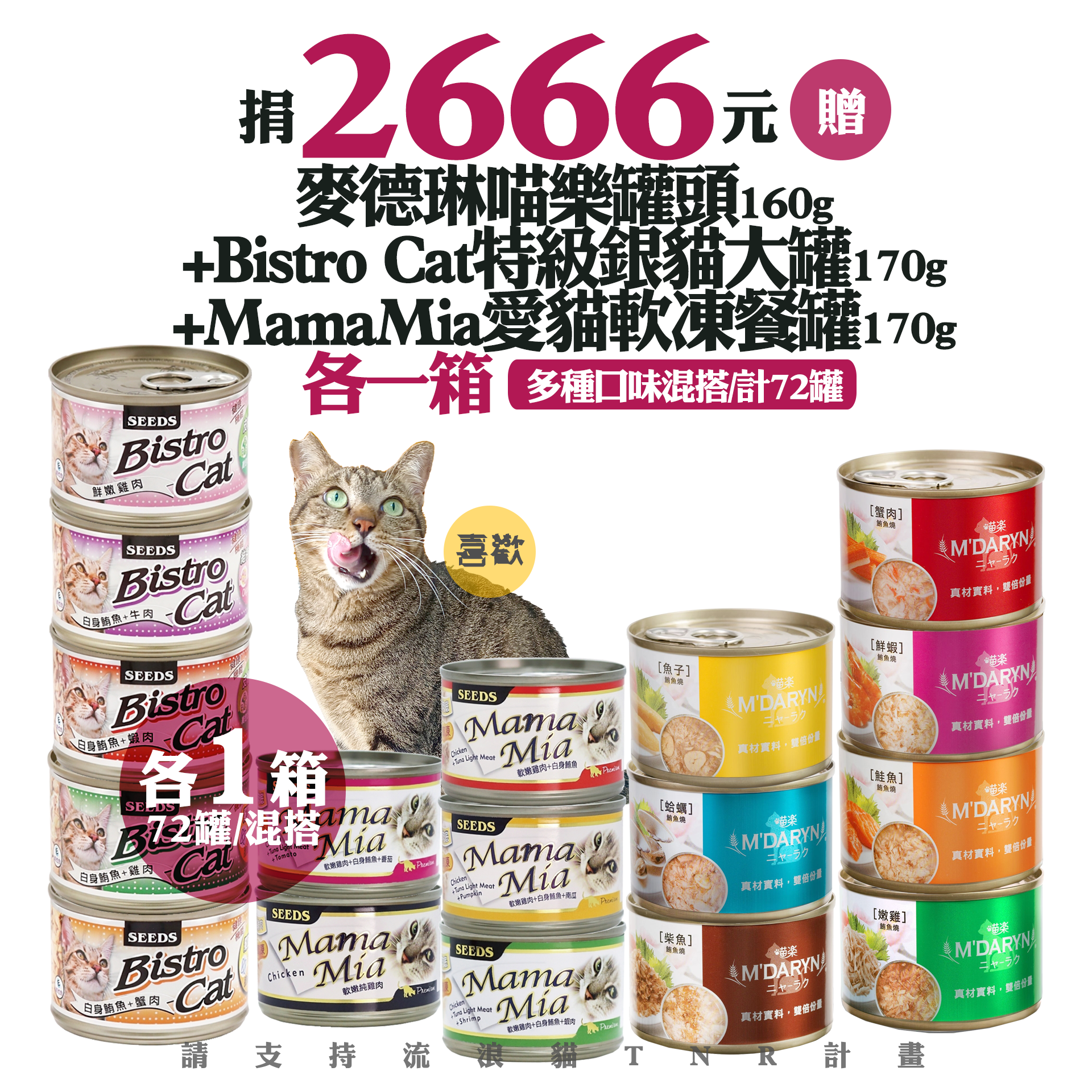 贈品名稱: 捐2666元贈麥德琳喵樂罐頭160g+Bistro Cat 特級銀貓大罐170g+MamaMia 愛貓軟凍餐罐170g各一箱(多種口味混搭/計72罐) 贈品總數: 50人 每人捐款金額: 2666元 已報名名額: 0 尚需求名額: 50 報名人員: 候補人員: 說明: 捐2666元贈麥德琳喵樂罐頭160g+Bistro Cat 特級銀貓大罐170g+MamaMia 愛貓軟凍餐罐170g各一箱(多種口味混搭/計72罐)