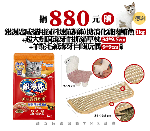贈品名稱: 捐880元贈銀湯匙成貓用飼料 速崩顆粒助消化雞肉鮪魚 1kg+超大劍麻潔牙耐抓貓草枕(34*9.5cm)+羊駝毛絨潔牙自嗨玩偶(9*9cm) 贈品總數: 20人 每人捐款金額: 880元 已報名名額: 0 尚需求名額: 20 報名人員: 候補人員: 說明: 捐880元贈銀湯匙成貓用飼料 速崩顆粒助消化雞肉鮪魚 1kg+超大劍麻潔牙耐抓貓草枕(34*9.5cm)+羊駝毛絨潔牙自嗨玩偶(9*9cm)