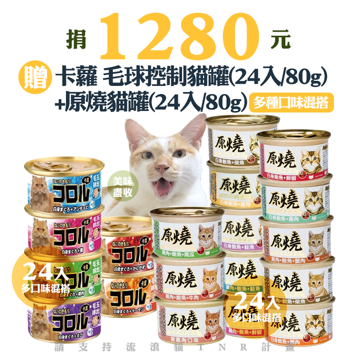 贈品名稱: 捐1280元贈卡蘿 毛球控制貓罐(24入/80g)+原燒貓罐(24入/80g)(多種口味混搭) 贈品總數: 50人 每人捐款金額: 1280元 已報名名額: 0 尚需求名額: 50 報名人員: 候補人員: 說明: 捐1280元贈卡蘿 毛球控制貓罐(24入/80g)+原燒貓罐(24入/80g)(多種口味混搭)