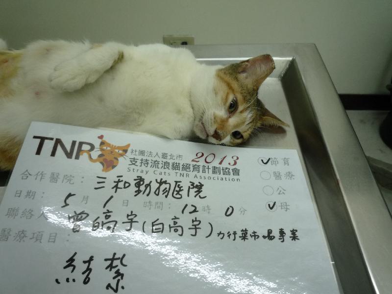 這隻貓咪在三重力行菜市場生活很久,雖然還算年輕,但是因為本區貓口眾多,所以牠已經懷過好幾胎了,真的很辛苦,終於這次有誘捕到,所以趕快帶牠來做結紮,讓牠以後不用再繼續受苦,希望各位好心大德能慷慨解囊,在此先行感謝了!(力行菜市場專案)
