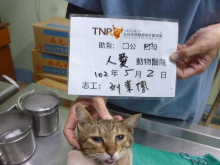 這是我在果菜市場捕獲的虎斑母貓, 果菜市場裡有幾個時段貓咪會跑出來, 數量還蠻多的, 但平時都躲起來, 誘捕到這隻母貓, 趕快送到醫院結紮. 0502-3