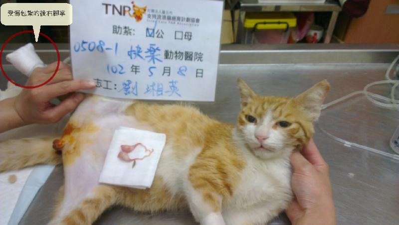 誘捕者暱稱: shining 性別: 公 花色: 橘白 誘捕地點: 彰化市 結紮醫院: 快樂寵物醫院 結紮費用: 1000 助紮者: 已付款:林蛋妞x1, Miss.Sx1, Phoenix Chungx1, nanax1 額外醫療費用申請: 特別說明與誘捕心情: 我這邊眷村空地新來的小橘子浪貓,已餵了一個禮拜,突然後腳掌腫大起來,本來就想送結紮,就順便治療腳傷,結果腳傷是由很小傷口感染裡頭都是膿,又引起淋巴腫大,且又有其他症狀:嘔吐、牙齦發白,口很臭,抽血也很難抽,血很清,醫生懷疑是胰臟炎,就用胰臟炎試劑測,說是有胰臟炎。現在先打點滴治療貧血與傷口打抗生素。