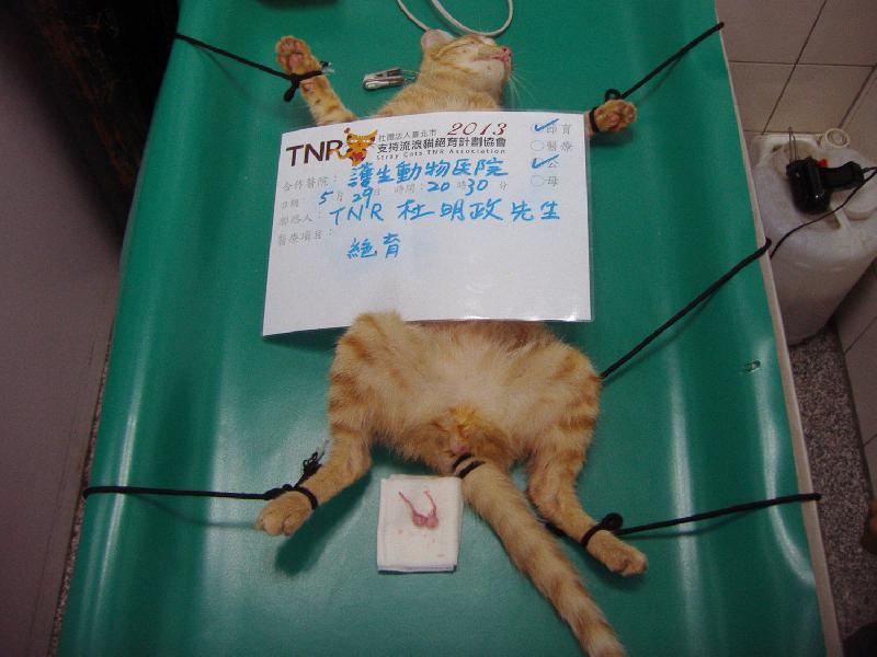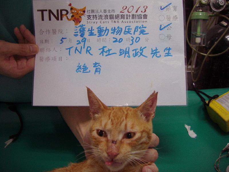 誘捕者暱稱: 臺北市支持流浪貓絕育計劃協會 性別: 公 花色: 橘虎斑 誘捕地點: 板橋防疫所 結紮醫院: 護生動物醫院 結紮費用: 800 助紮者: 已付款:Nounoursx3 額外醫療費用申請: 特別說明與誘捕心情: 繁殖潮來臨!各地收容所大爆滿,全都是貓,板橋防疫所內,更是貓滿為患,貓已經無籠位可放,小貓一籠一籠的,放於紙箱,放於外出籠內,5月29日,志工前去,將健康的貓,能野放的,先領出,共33隻,分送4家合作醫院進行絕育手術,並在安排野放,也暫時疏解了收容所的安樂的時間,希望有更多人能幫忙,一起幫貓咪結紮,或領出中途,免於被安樂死的命運。