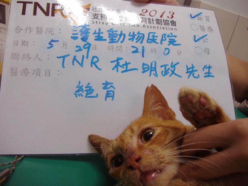 誘捕者暱稱: 臺北市支持流浪貓絕育計劃協會 性別: 公 花色: 橘白 誘捕地點: 板橋防疫所 結紮醫院: 護生動物醫院 結紮費用: 800 助紮者: 已付款:Kat Changx1, 妃妃x2 額外醫療費用申請: 特別說明與誘捕心情: 繁殖潮來臨!各地收容所大爆滿,全都是貓,板橋防疫所內,更是貓滿為患,貓已經無籠位可放,小貓一籠一籠的,放於紙箱,放於外出籠內,5月29日,志工前去,將健康的貓,能野放的,先領出,共33隻,分送4家合作醫院進行絕育手術,並在安排野放,也暫時疏解了收容所的安樂的時間,希望有更多人能幫忙,一起幫貓咪結紮,或領出中途,免於被安樂死的命運。