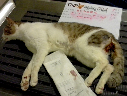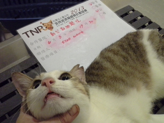 誘捕者暱稱: Star Wang 性別: 公 花色: 白底虎斑 誘捕地點: 中正路與鐵道路口 結紮醫院: 新竺動物醫院 結紮費用: 800 助紮者: 已付款:Kane&Bibox1, Jau Shiang Hsiehx2 額外醫療費用申請: 特別說明與誘捕心情: 這是某天下午到中正路與鐵道路口吃臭豆腐時發現的貓群,