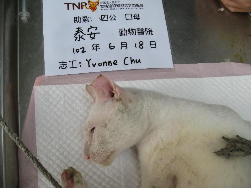 誘捕者暱稱: Yvonne49 性別: 公 花色: 白色帶一點點黑塊 誘捕地點: 高雄鳳山海洋二路 結紮醫院: 泰安動物醫院 結紮費用: 700 助紮者: 已付款:寶妮x1, 惠惠x2 額外醫療費用申請: 無 特別說明與誘捕心情: 這隻公貓是最近才來這裡打拼生活的新貓,蠻害羞緊張的,在誘捕籠裡一直衝撞所以用黑色塑膠袋蓋著。在這裡不常見到牠,會抓到牠是因為那晚突然不知從何而來一隻小小貓一直在車底下哀叫,本來是拿了誘捕籠準備抓小貓的,但小貓看到誘捕籠跑得不見踪影却見到這隻白貓....牠的長相很特別...呆呆的....很惹人憐愛,希望幫牠結紮後以後不用再為傳宗接代打拼!謝謝協會協助募款,謝謝捐款人您的善心大愛幫助了這隻貓。