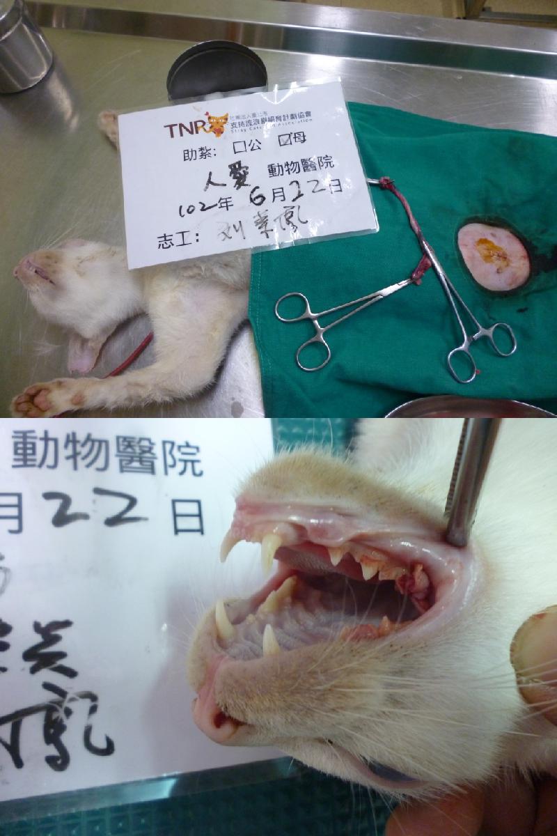 這隻漂亮的白黃色貓咪, 有著淡藍色的眼睛很美, 但還蠻緊張的. 結紮手術時發現她有嚴重口炎, 醫生了解協會的醫助案件很多與募款的辛苦, 此貓咪申請1000口炎醫療費, 不申請醫助. 0622-1