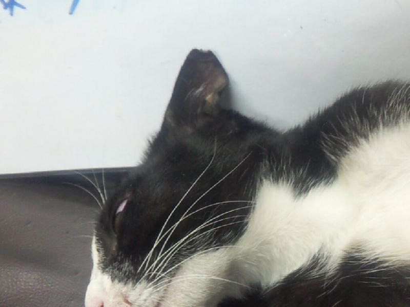 這隻賓士貓也是長期餵食的貓~長得很有特色ㄉ喵~身穿了燕尾服~不過因為太緊張哩~老式撞籠~帥帥ㄉ鼻子都撞傷了~
