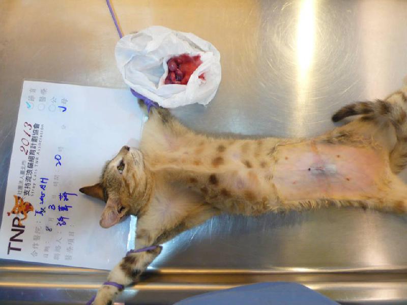 節紮頭好壯壯公貓時,意外發現這隻三腳貓,優先送到醫院節紮並檢查傷口,右腳腳指頭全部不見已經自行癒合,傷口整齊,不像捕獸夾所傷。經詢問餵食者,告知為新來的朋友,已請餵食者多注意他的狀況,另外在肚子發現套了ㄧ條橡皮筋導致濕疹,要多住幾天觀察及吃藥,謝謝大家的幫忙。