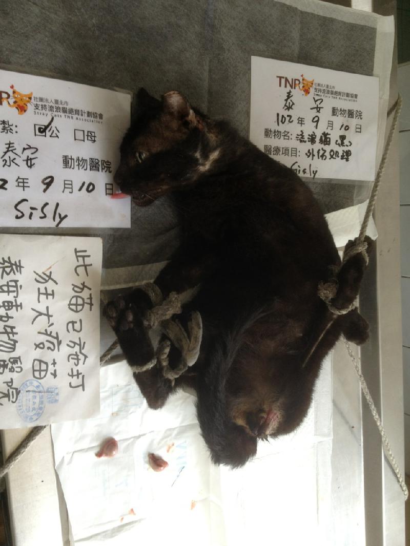 五甲娘家 家人說在附近巷子看到一隻貓脖子和背後有紅紅的外傷, 以為是橡皮筋, 結果不是, 醫生說是外傷, 不知是如何造成, 已經申請醫助, 麻醉狀況下,醫生視狀況ok, 也幫他做了結紮手術.