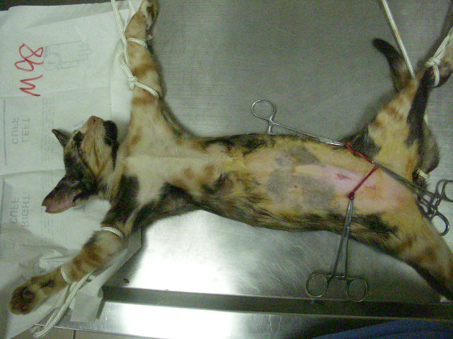 結紮臨出院之際貓咪出現鼻氣管炎的現象,食慾變差,有輕微淚眼,打噴嚏,醫師嘗試把藥放在罐頭裡,貓不願意吃,要打抗生素,貓又緊張的在籠子內亂竄,只好打長效抗生素以免每天打針造成緊迫,所幸治療後貓咪狀況改善許多,胃口正常也胖了一圈,R回原處由愛心媽媽繼續照顧。