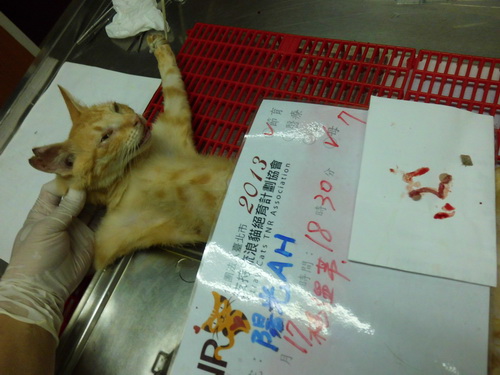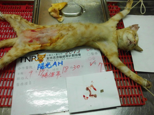 誘捕者暱稱: 楊溫蒂 性別: 母 花色: 橘貓 誘捕地點: 九份 結紮醫院: 陽光犬貓專科醫院 結紮費用: 1500 助紮者: 已付款:小七x2, 朱小妞x3 額外醫療費用申請: 特別說明與誘捕心情: 20130916在R回九份貓時,想說下山前車子開到廟旁清洗消毒所有的外出籠,也因為時間點剛好天黑了,廟旁零零散散來了ㄧ群橘貓家族出外覓食,心想既然要下山回台北,索性將這群也做TNR吧!其實山上的貓太多了真的抓不完,我只能盡自己微薄的力量來控制他們的數量。數日前陽光動物醫院的廖醫生剛好去九份老街觀光,說看到了很多剪耳貓也拍了ㄧ些照片,我說那些TNR的貓絕大部份是您手術的。還真有趣。。。這兩年積極推動九份觀光老街TNR,浪貓數量控制的非常好。由衷感謝協會和愛心捐款人士幫忙。