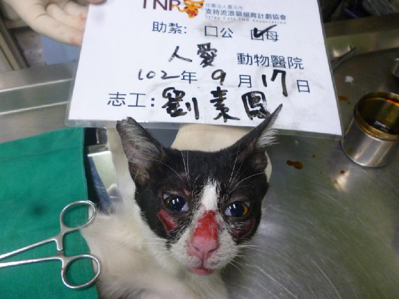 此貓不只是撞得鼻青臉腫~臉頰傷口還有像掀起來的感覺~原因不明~ 需申請1000的醫療. 0917-1