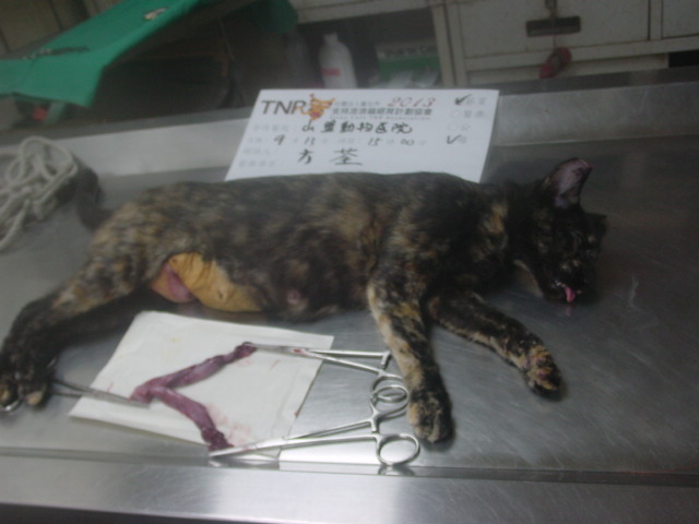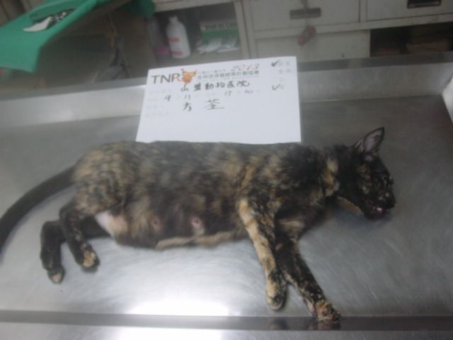 玳瑁色貓媽媽一直生了很多胎,這次終於誘捕成功做節育手術。