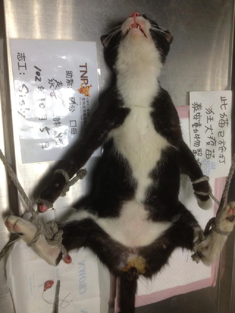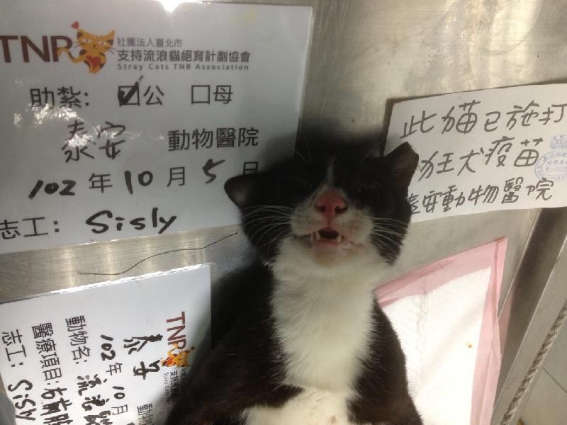 這是在一個保養廠出沒的浪貓之一,保養廠不錯不會趕他們,所以貓都會進出躲藏,這隻貓的腳斷掌已經很久了,他還是都會去撐地,結紮時會留院兩週觀察斷掌處的狀況並治療破皮的部份喔