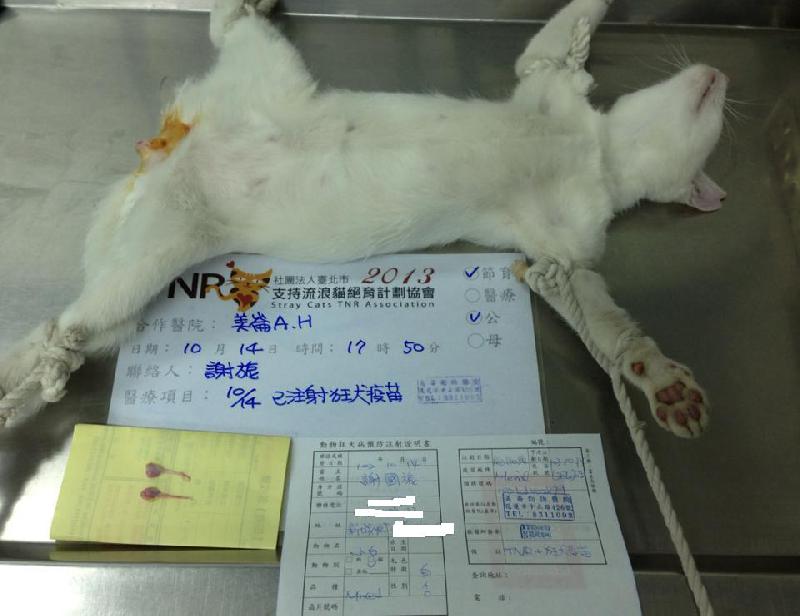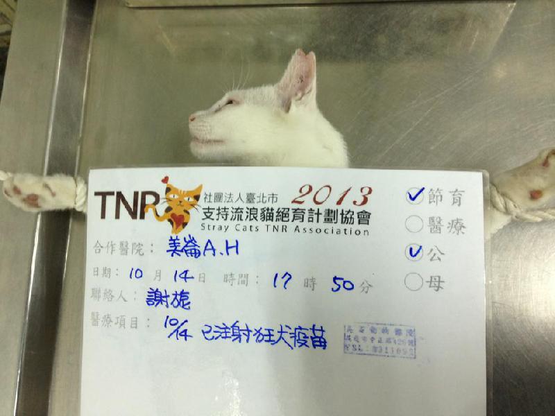 誘捕者暱稱: 謝旎 性別: 公 花色: 白 誘捕地點: 花蓮市中華市場 結紮醫院: 美崙動物醫院 結紮費用: 800 助紮者: 已付款:chairnlingx1, 火鳳貍x2 額外醫療費用申請: 特別說明與誘捕心情: 市場內幾乎都是花貓