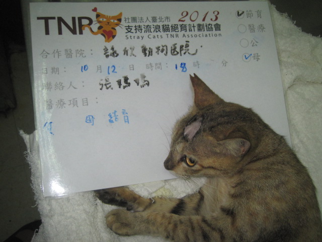 誘捕者暱稱: 張媽媽 性別: 母 花色: 虎斑 誘捕地點: 十分 結紮醫院: 詠欣動物醫院 結紮費用: 1500 助紮者: 已付款:姿姿x1, chengx1, Example Chenx3 額外醫療費用申請: 特別說明與誘捕心情: 到十分找尋受傷的母狗,意外發現當地有許多貓咪沒有結紮,雖然住戶會將吃剩的食物分給貓咪吃,但沒有固定在做餵食,詢問住戶,發現這裡的貓咪命運就是不斷生育,幼貓營養來源不夠會慢慢逝去,母貓有可能因為長期生育身體狀況不佳死亡率很高,但因為該地區狀況不是很好,跟居民協調希望已TNR的方式控制貓咪的數量,讓這些貓有更好的生活品質,透過結紮、除蚤讓貓咪身體更健康,免於生育之苦,也能更長壽,因為貓隻數量實在太多,還請各位幫忙這些貓咪。