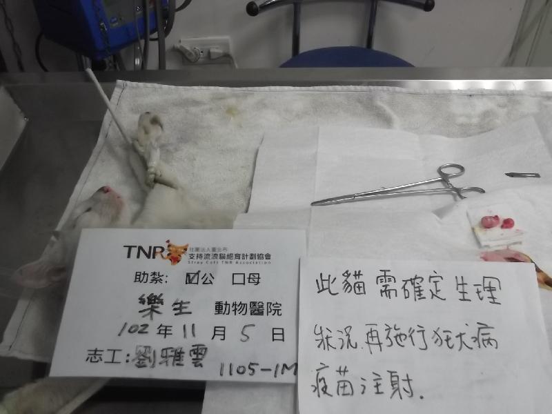 上班途中發現的白貓, 很漂亮, 看他眼睛有一點分泌物誘捕他結紮並請醫生看看. 有一顆隱睪, 也幫他做了隱睪摘除開了一個小洞, 會讓他住一週到拆線, 申請醫療1000 謝謝 1105-1M
