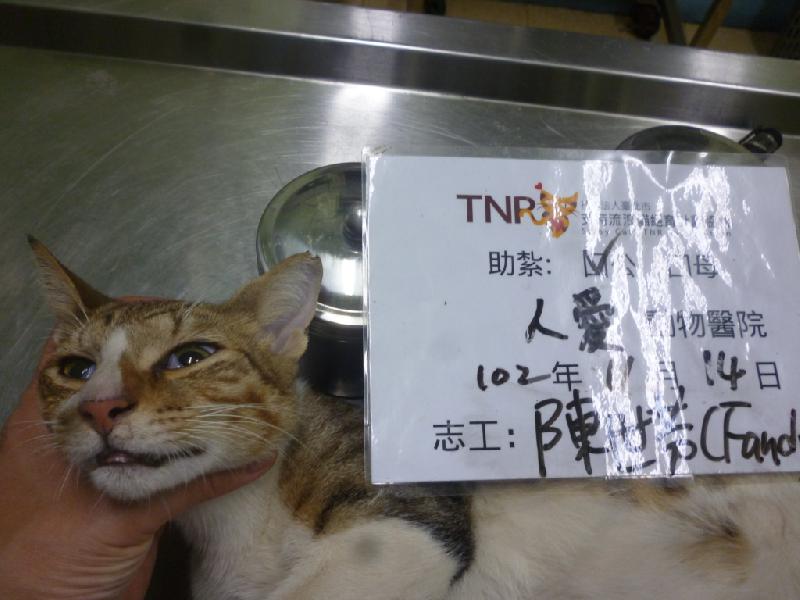 這是我固定餵養的TNR區,這隻是出現兩個多月的新貓,很信任我,一分鐘就進籠抓到了,一直以為牠是母貓,看起來很秀氣女生臉,到院後才知道是公貓。