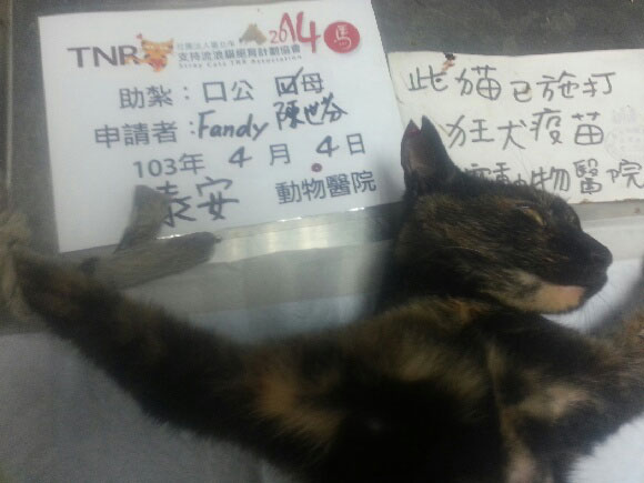 這是通報案件,幫小港區簡小姐抓的貓,對方是學生,無經濟能力,約有10幾隻貓,有7∼8隻母貓,生活在水溝巷,結紮後停止生產線不要再生了。